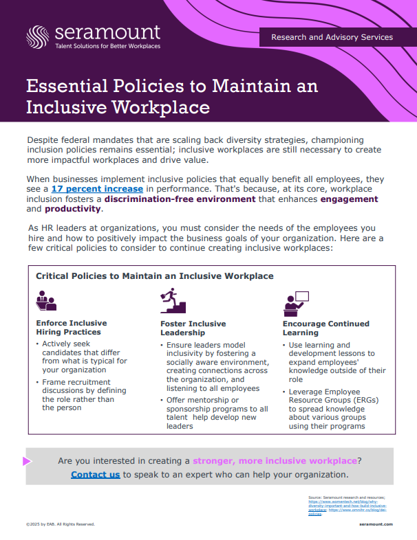 With the workplace environment changing, it’s important to remember what makes it so successful. One way many workplaces see success if by championing inclusion. Download our latest resource to learn which policies are critical for employers to utilize to maintain an inclusive workplace.
