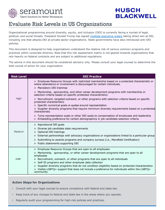 Organizational programming around diversity, equity, and inclusion (DEI) is currently facing a myriad of legal, political, and social threats. This risk assessment matrix is designed to help organizations understand the relative risk of various common programs and practices within corporate America.