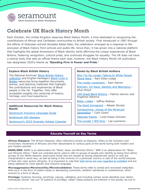 Each October, the United Kingdom observes Black History Month, a time dedicated to recognizing the contributions of African and Caribbean communities to British society. This employee-facing one-pager provides resources for understanding the purpose of the month and why we should celebrate it.