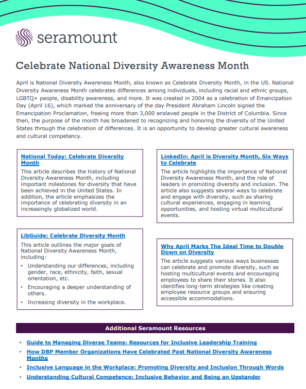 April is National Diversity Awareness Month in the US. This employee-facing one-pager provides resources for understanding the purpose of the month and why we should celebrate it.