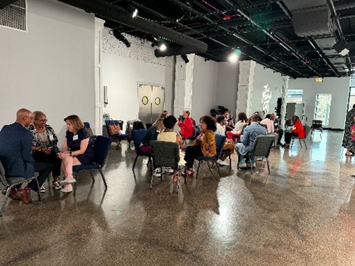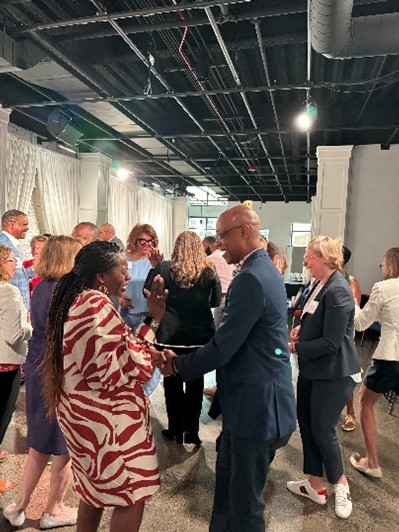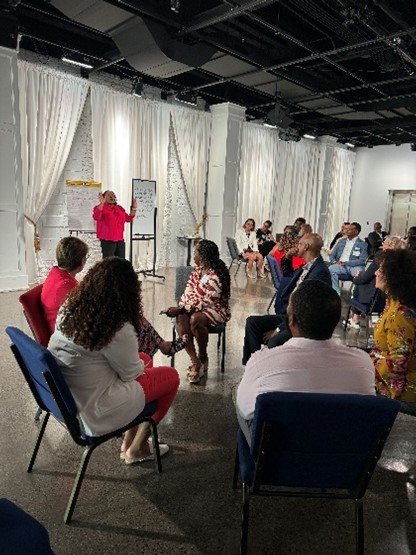 Throughout the morning, the group of CDOs came together and engaged in classic improv exercises that honed their communication skills and built empathy in a way that would enhance their work in the diversity, equity, and inclusion (DEI) space of corporate America. These exercises included learning how adaptation can lead to collaboration and inclusion, listening to a full statement because the most important information is often at the end, and learning how word choice and the person who delivers the message can change how it is perceived. One exercise allowed participants to acknowledge their own accomplishments and have a partner repeat them back. This game demonstrated that taking time to listen and build relationships within your team helps build empathy. Empathy and active listening foster psychologically safe environments and create space for vulnerability, leading to more creativity and innovation.