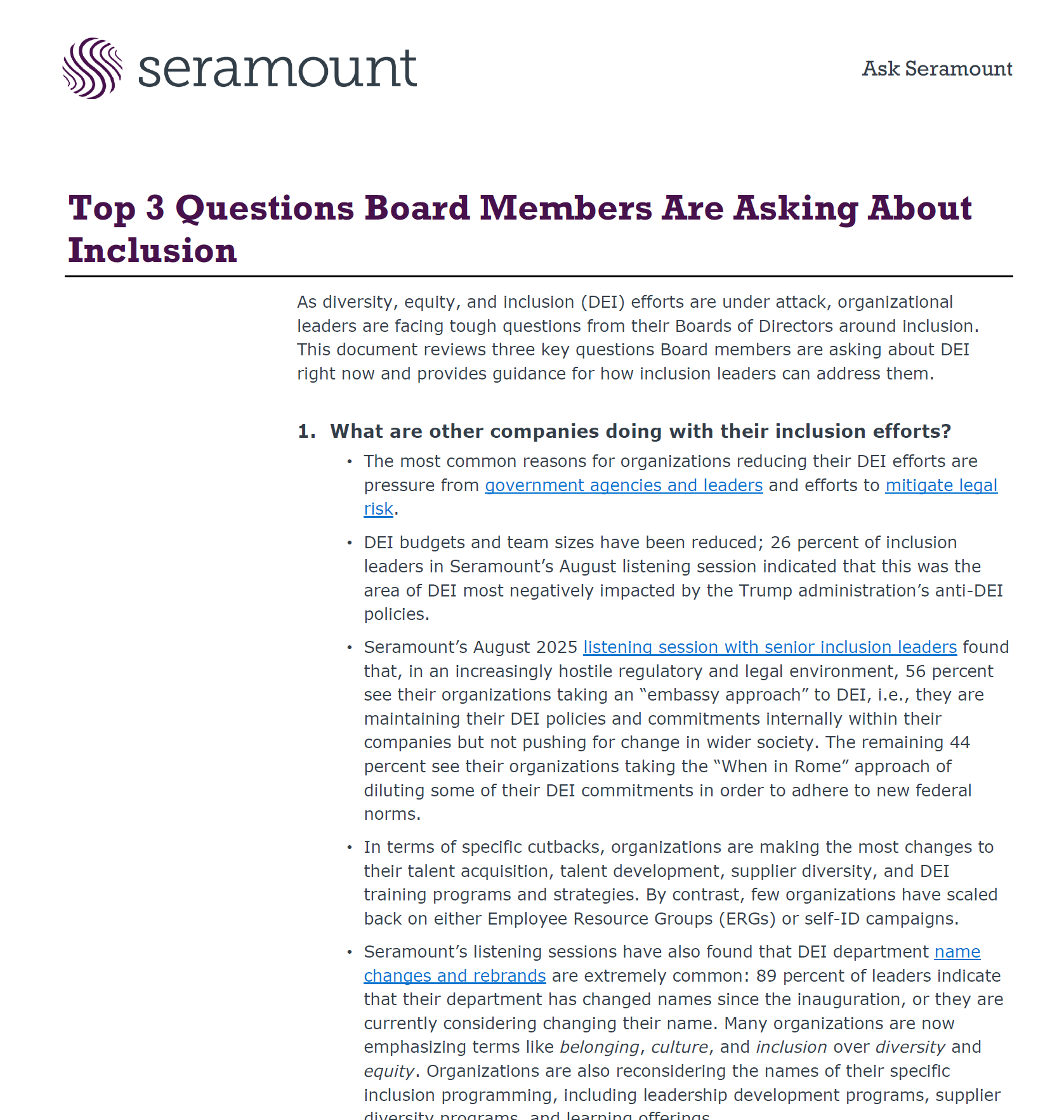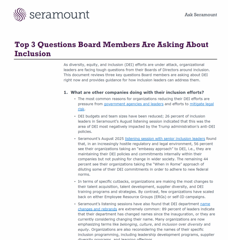 This report outlines the three most pressing questions corporate boards are posing to leaders about inclusion in 2025. First, boards are asking what other companies are doing as many organizations rebrand or scale back their efforts under political and legal pressure, often replacing “DEI” with terms like “belonging” or “culture.” Second, they’re weighing the risks of maintaining versus reducing inclusion initiatives—while scaling back may lower legal exposure, it can harm reputation, workforce engagement, and customer loyalty. Finally, boards want guidance on communicating inclusion effectively by linking it to business goals, embedding it across departments, using inclusive language, and leveraging ERGs to reinforce belonging for all employees.