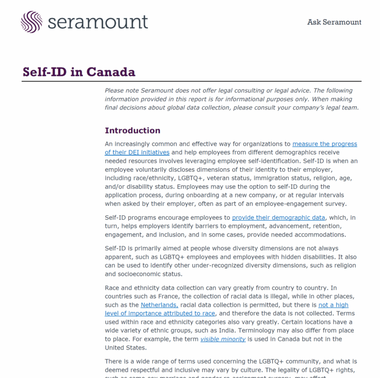This report outlines best practices and legal considerations for employee self-identification (Self-ID) in Canada. It explains how voluntary Self-ID helps measure workforce diversity, identify barriers, and improve inclusion. The report details key regulations such as PIPEDA and the Employment Equity Act, which mandate collecting data on women, Indigenous peoples, persons with disabilities, and visible minorities. It also highlights inclusive approaches to gender identity and sexuality questions, bilingual (English/French) survey design, and growing interest in capturing data on disability, immigration, and LGBTQ+ status.