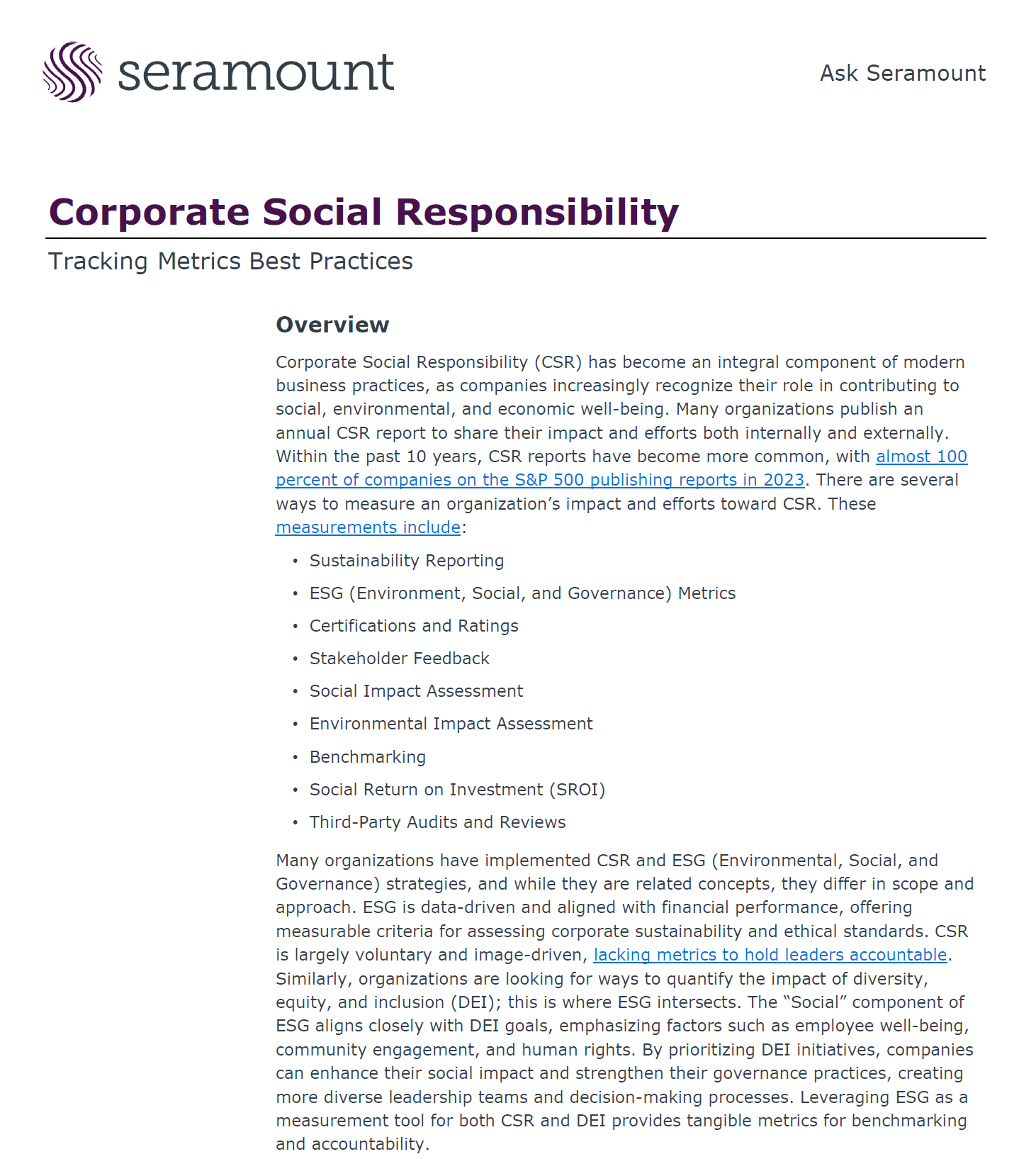 This resource outlines how organizations can measure and report the impact of their Corporate Social Responsibility (CSR) initiatives. It explains the link between CSR, ESG (Environmental, Social, and Governance), and DEI, highlighting how tracking metrics in areas like sustainability, employee well-being, and ethics drives accountability and transparency. The guide details key performance indicators across environmental, social, and governance categories, recent regulatory updates like the SEC’s 2024 climate disclosure rule, and tools such as Millie, Benevity, and Submittable for CSR data tracking and reporting.