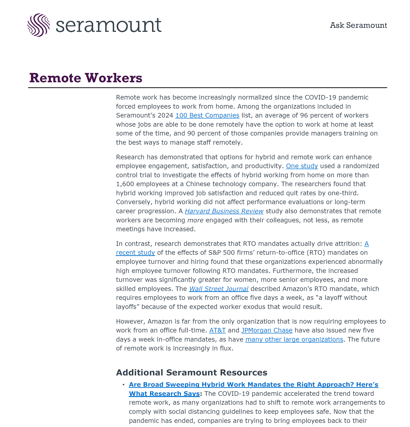 This report examines the current state of remote and hybrid work, noting that 96% of Seramount’s 100 Best Companies offer remote options and 90% train managers on remote leadership. Research shows that hybrid work improves satisfaction and retention without harming performance, while rigid return-to-office (RTO) mandates have led to higher turnover—especially among women and senior employees. The report contrasts flexible models with strict in-office policies at companies like Amazon and JPMorgan Chase and includes additional Seramount resources to help organizations design inclusive, effective, and sustainable hybrid work strategies.