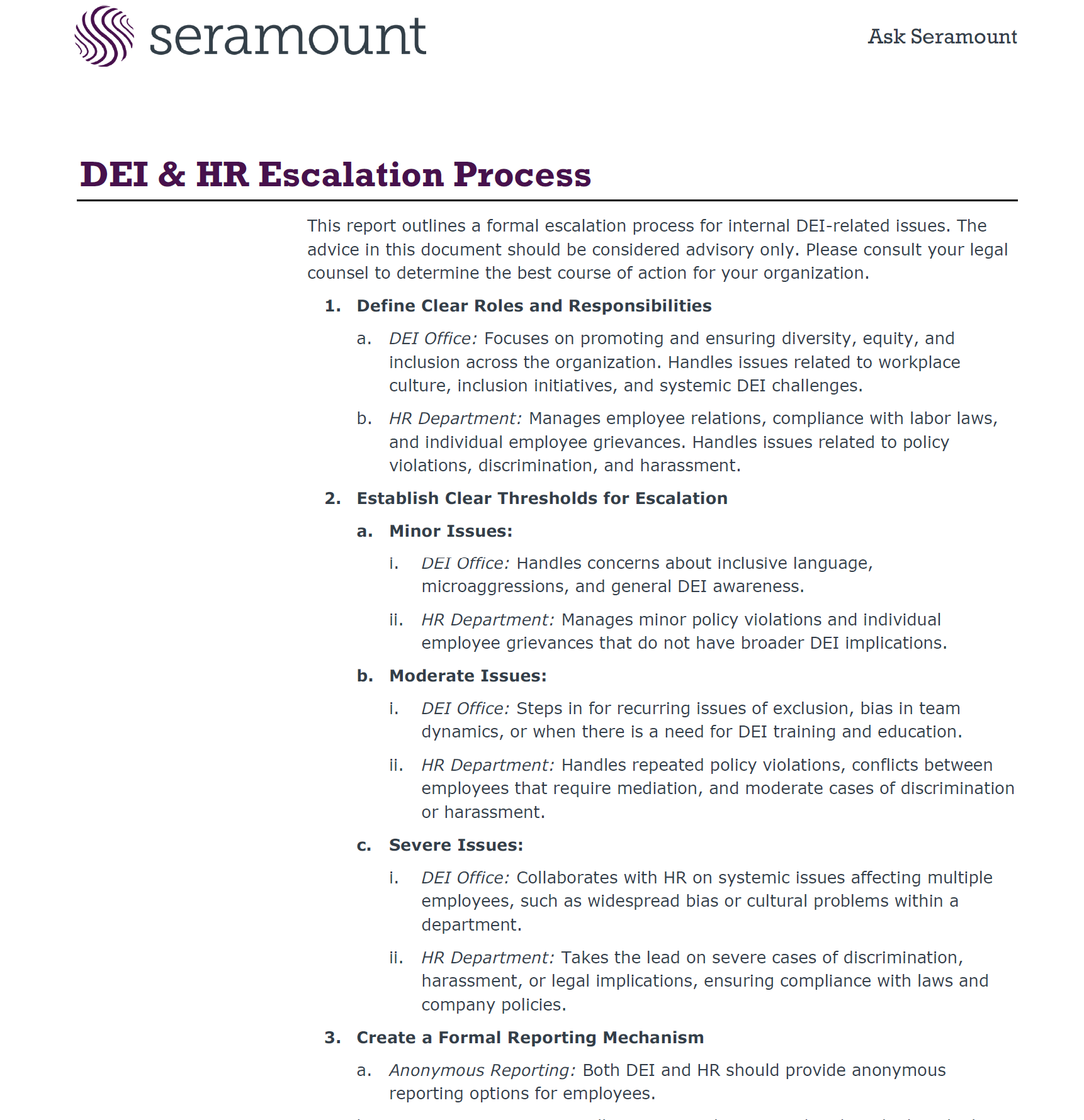 This guide outlines a structured process for managing and escalating DEI-related issues between DEI and HR teams. It defines clear roles, thresholds for escalation—from minor inclusion concerns to severe discrimination cases—and emphasizes documentation, training, and communication. The framework promotes transparency through anonymous reporting, leadership involvement, and ongoing feedback to strengthen workplace culture and ensure fair, consistent resolution of DEI challenges.